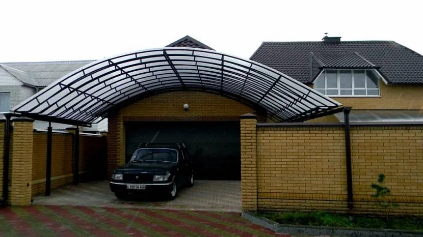 - Арочная форма обладает повышенной жесткостью, очень стойкая. Создавая арочный навес, угол уклона необходимо сделать не выше 10 градусов. При обустройстве арочных систем не нужен монтаж желоба водостока.