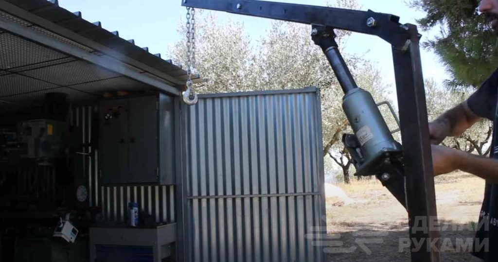 включает установку стрелы, состоящей из отрезка трубы меньшего диаметра, с несколькими отверстиями. Она вставляется внутрь верхней части рамы, соединенной домкратом с основанием крана, и выдвигается на необходимую длину. Затем стрела крепится к основной трубе болтом и гайкой, а на ее конец устанавливается цепь и мощный крюк.