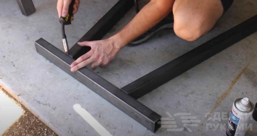 При помощи болгарки отрезаем заготовки подходящей длины, и свариваем основание. После этого к опоре необходимо будет приварить вертикальную стойку.