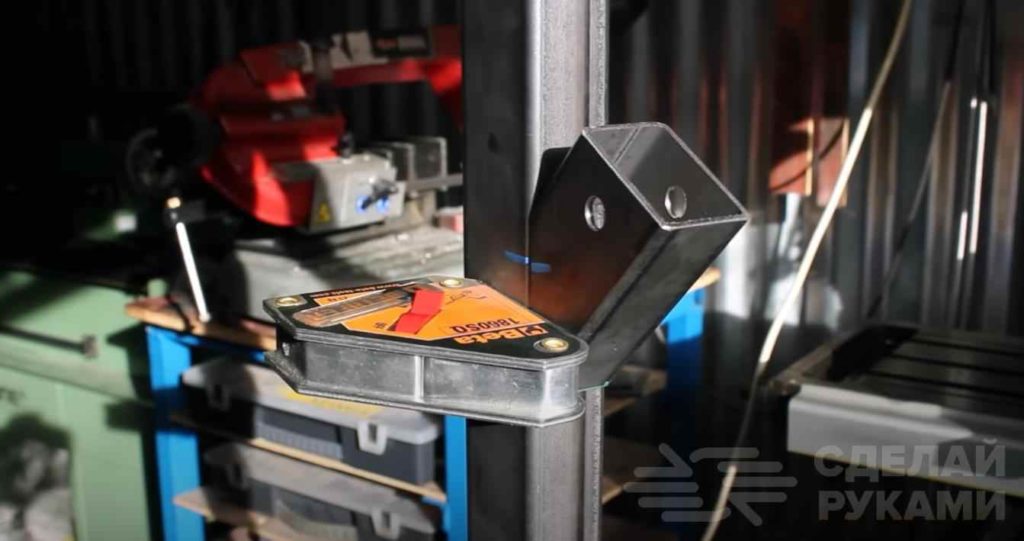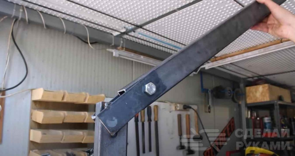 Рама сваривается из стальных труб квадратного сечения. Само собой стойка и основа должны быть максимально крепкими. Чтобы можно было менять угол стрелы, сверлим в стойке и стреле отверстия и ввариваем трубы на их места в качестве втулок. Такая конструкция создает надежное соединение. Соединяется все это стальным стержнем или болтом с гайкой. Основа представляет собой крестовину. Стойку укрепляем отрезками труб.