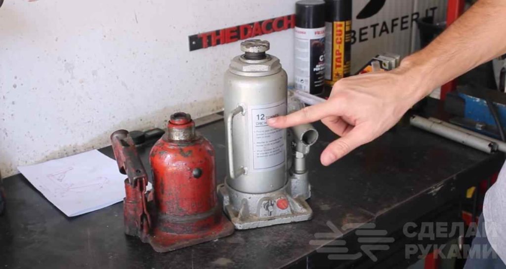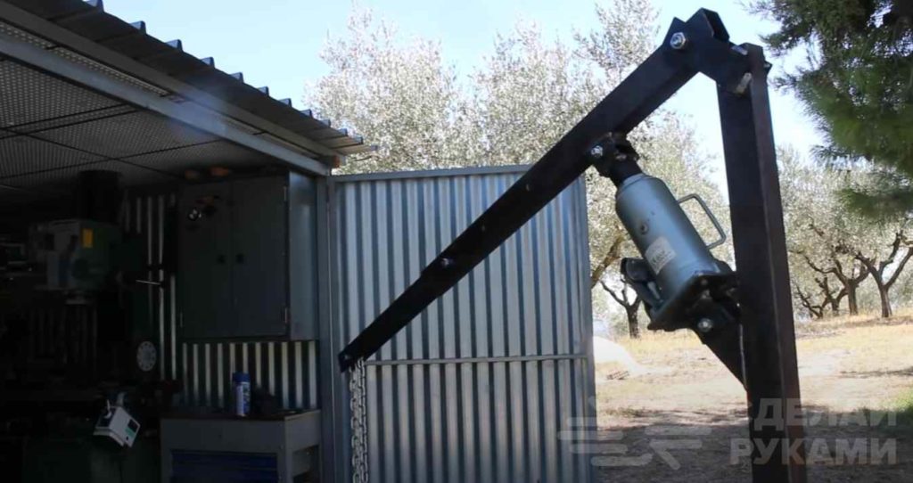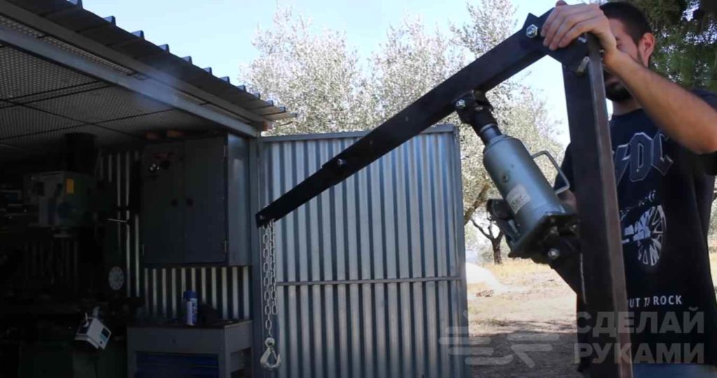 В качестве привода, который будет поднимать и опускать стрелу, используем гидравлический домкрат грузоподъемностью 12 тонн (можно и другой домкрат взять).