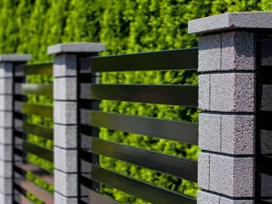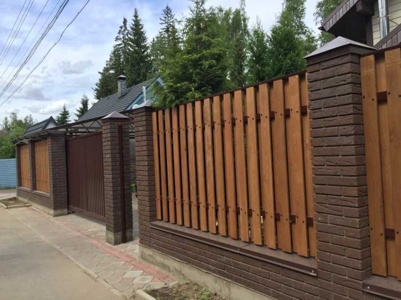 - кирпичные столбы с промежуточными секциями из штакетника;