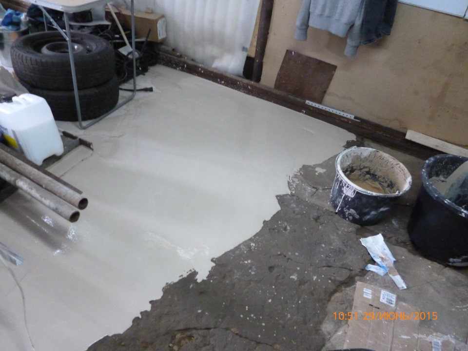 - Окрашивание начинается с дальнего угла. Состав рекомендуют наносить по квадратам, двигаясь вдоль стен по направлению к выходу из гаража.