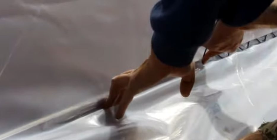 Крепление пленки может выполняться также с помощью проделанных отверстий, в которые вставлены специальные металлические зажимы, не позволяющие материалу разрушаться дальше. Но такой подход возможен только для очень прочных полимерных материалов.