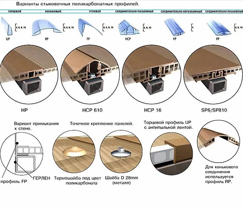 Крепление выполняют таким образом: панели монтируют в паз неразъемного профиля, соответствующего толщине листов поликарбоната. После этого профиль фиксируют с каркасом при помощи саморезов с термошайбами.