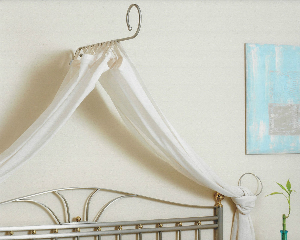 К изголовью кровати прикрепить металлическую трубу, гнутую в сторону центра кровати. На неё уже крепится круг-основа. Так как каркас, на который вешается тканевое полотно, монтируется опорами к кровати, то балдахин необходимо шить из лёгких струящихся тканей. Чтобы металлическая труба была незаметна, её красят в белый цвет.