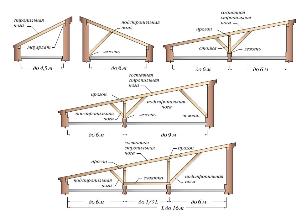 Стропильная система очень простая, нет необходимости устанавливать различные упоры и подкосы, прогоны и коньки. Балки кладут прямо на несущие стены небольшого строения или на обвязочный пояс.