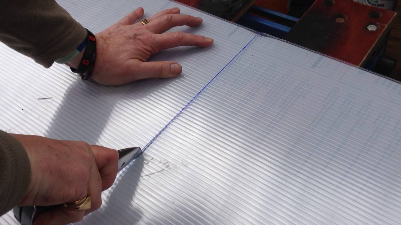 Нарезаются листы поликарбоната в размер. Можно заранее не вырезать материал по требуемым размерам, сделать это после их установки при помощи ножа;
