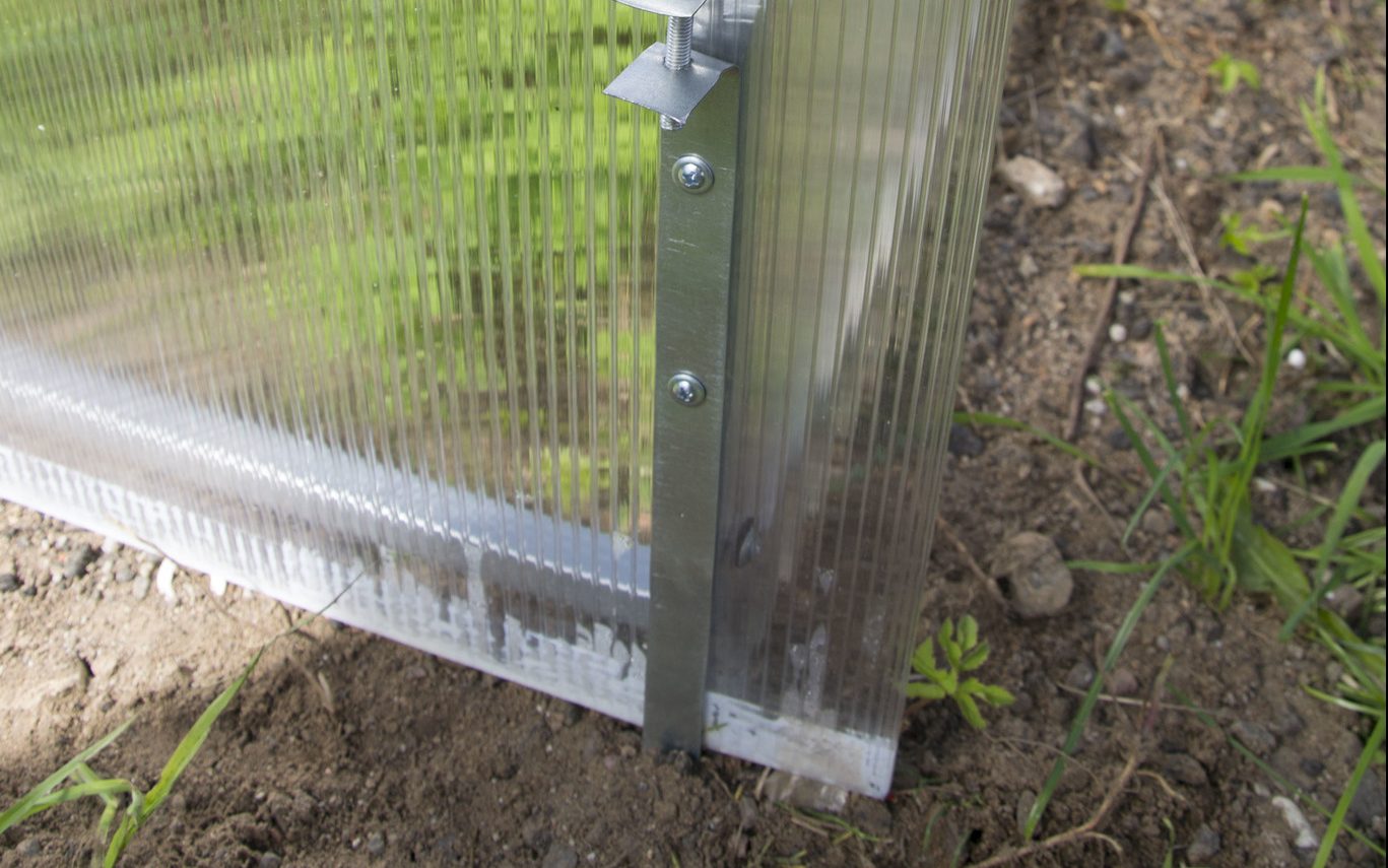 Верхний треугольник поликарбоната должен накладываться немного внахлест на боковые листы. Сторона с защитой от УФ-лучей должна быть снаружи теплицы.