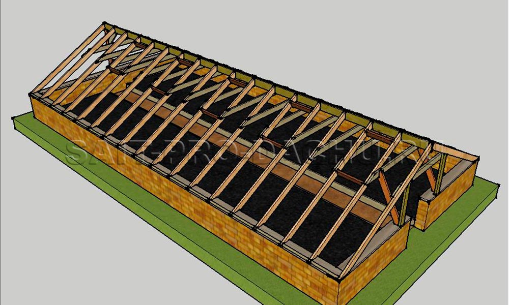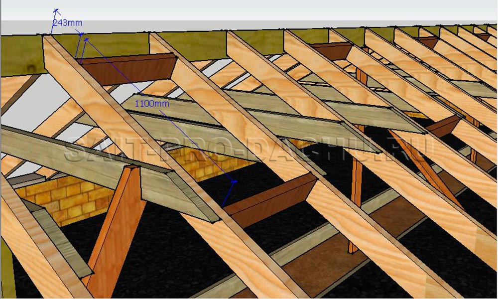 Также дополнительную жесткость каркасу придадут и стропильные распорки. Их мы запланировали только между промежуточными стропильными парами, так как именно они образуют короба для будущих вентиляционных окон.