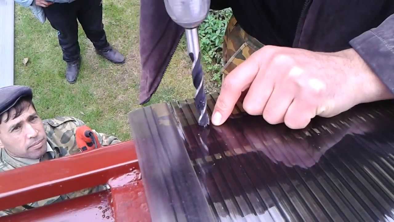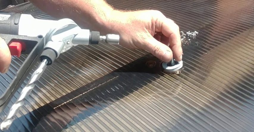 Высверлить отверстия под крепежи на обрешетке крыши и на полотнах. От края необходимо отступить не менее 40 мм, диаметр отверстия должен быть чуть больше диаметра самореза. Удалить остатки сверления с поликарбоната (стружку);