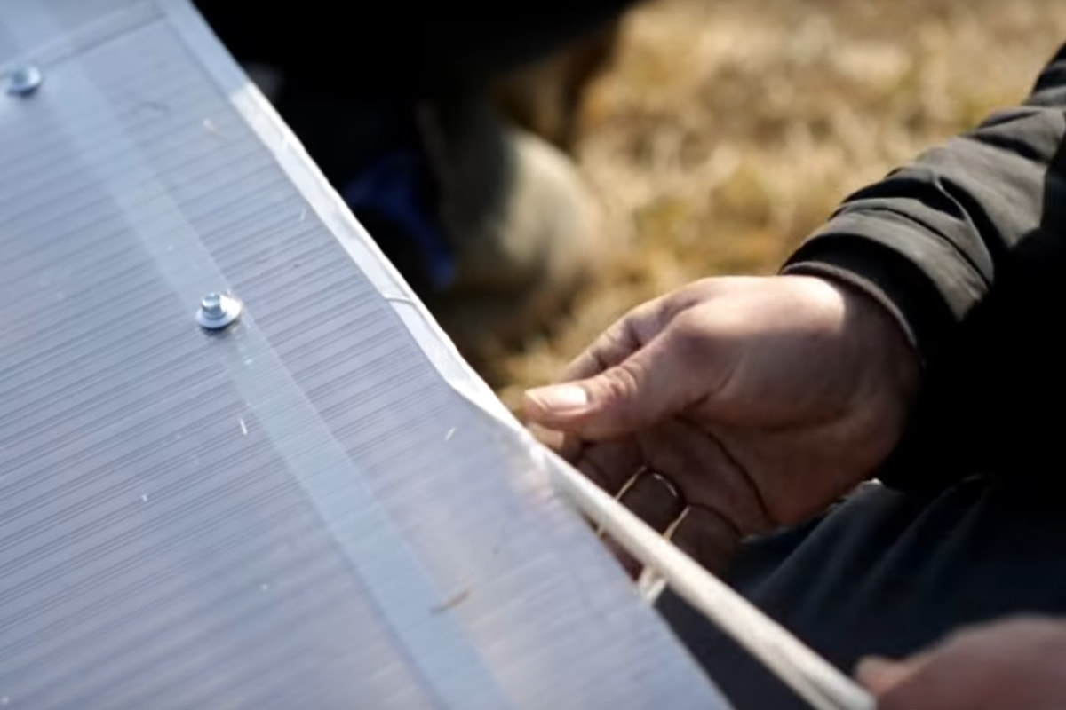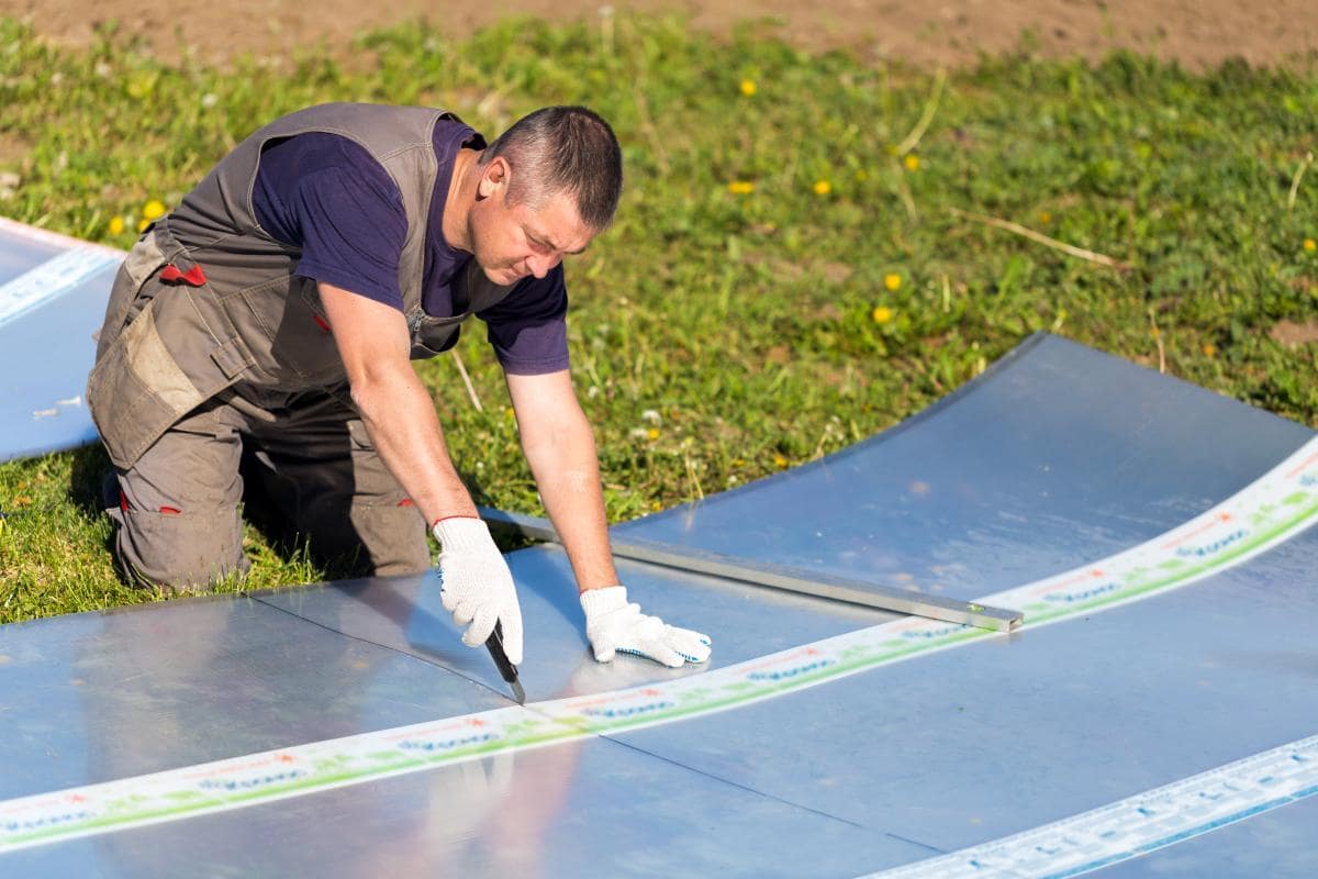 Уложить листы на каркас крыши и разметить места крепления и раскроя. Раскроить материал при необходимости, отрезать лишние участки. Выполняются эти действия на ровном участке земли;