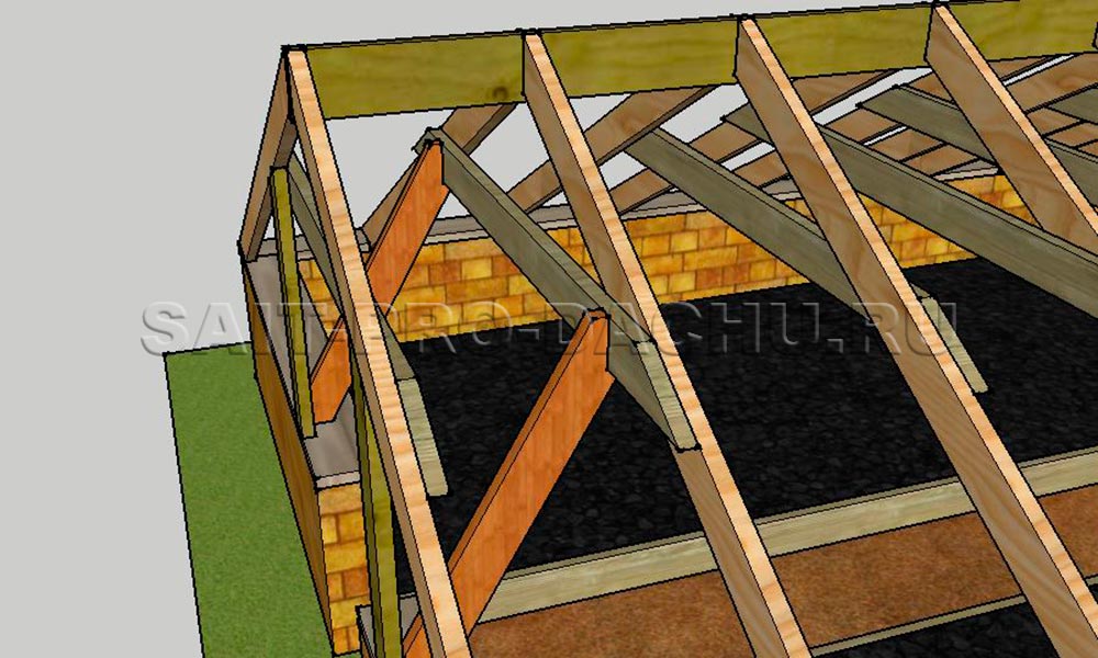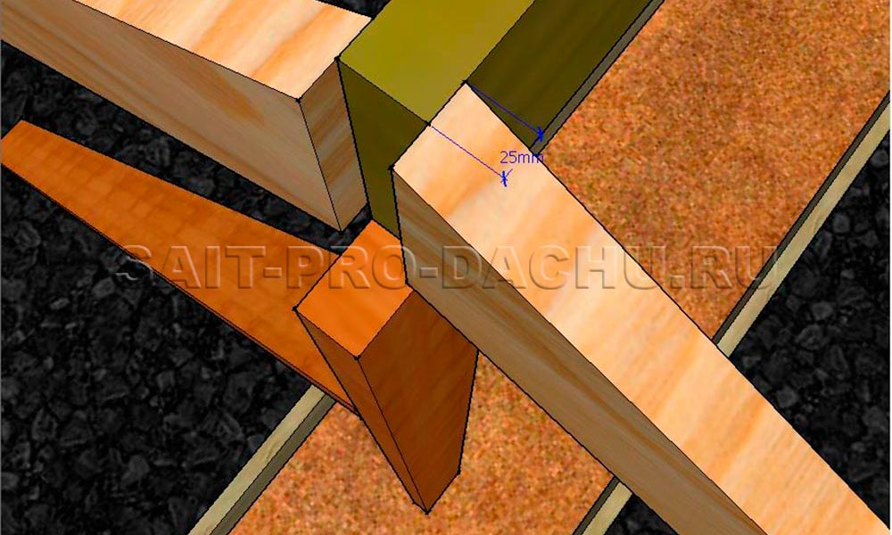 Но это не единственные распорки, что используются в данном виде кровли, аналогичные элементы, только из срезанного под углом пятидесятого бруса, нужно установить и между всеми без исключения стропилами, прибивая от мауэрлата.