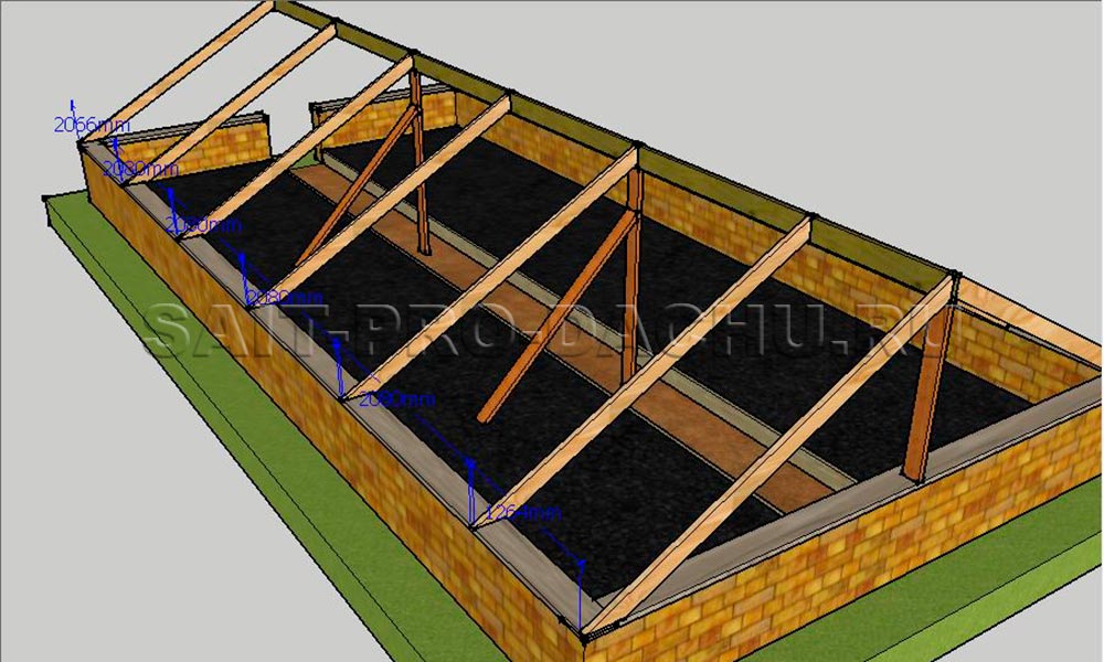При этом величина 4270 не случайна. Ширина сотового поликарбоната 2100 мм и это нужно учитывать, рассчитывая шаг между стропильными ногами. Если в качестве последних использовать доску сечением 150×50 мм, то расстояние между фронтонной и соседствующей парой будет равняться 2066 мм, а между остальными 2080 мм.