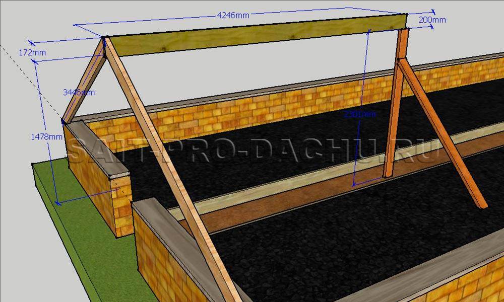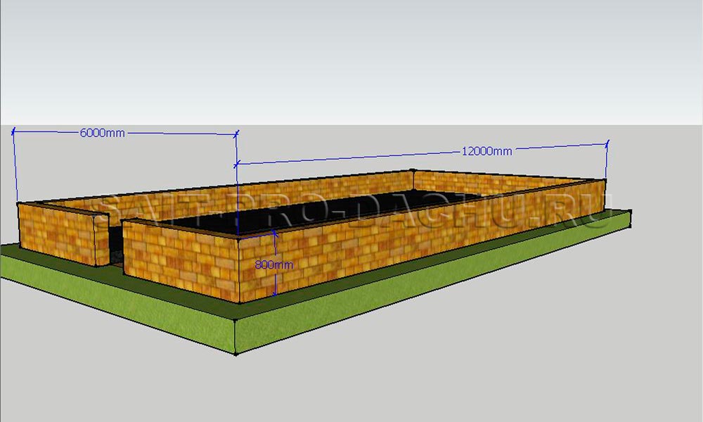 Для наглядного примера возьмём теплицу с уже отлитым фундаментом и построенными кирпичными стенами. Длинна сооружения двенадцать метров, ширина – шесть. Довольно-таки типичный укрывной огородик, который обеспечит свежими овощами даже немалую семью.