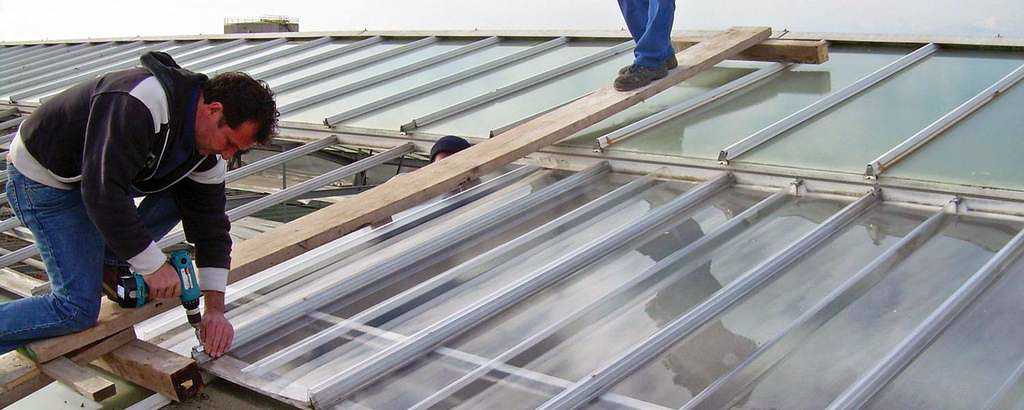 Соединять листы поликарбоната в единую конструкцию проще на земле. Иногда производители делают лишком узкими пазы и на крыше будет затруднительно вогнать один лист в другой. Крепятся листы к профилю при помощи саморезов. Последние покрываются составом на основе битума, чтобы исключить попадание влаги через щели между саморезом и поликарбонатом.