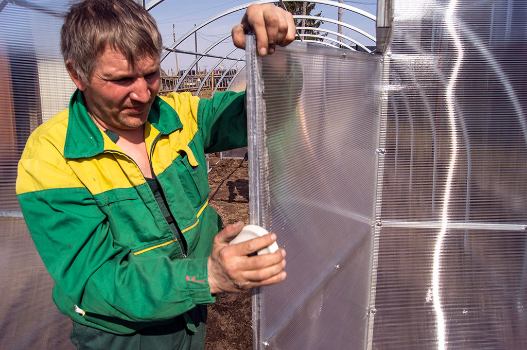 Поликарбонат к крыше теплицы крепиться своими силами при помощи подручных материалов. Понадобиться лишь немного времени и сноровки. Ещё одна пара рук будет не лишней, а лучше взять 2-х помощников.