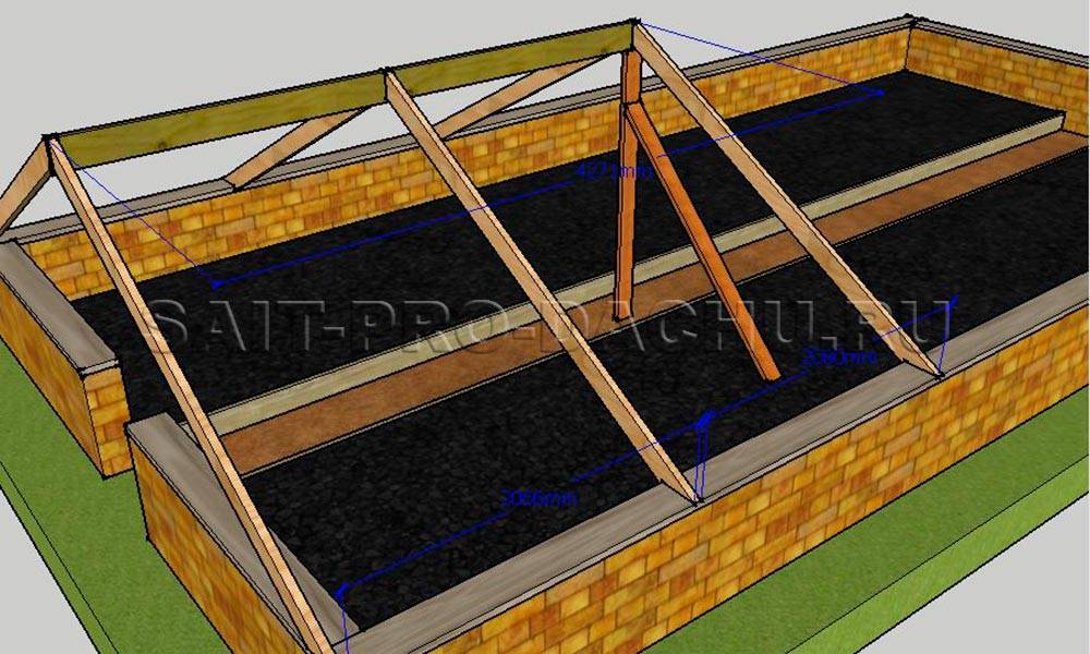 Но это только центральные стропила, на которые будут опираться торцы сотового поликарбоната, но нужно установить и промежуточные. По две пары в каждом образовавшемся пролете, кроме последнего.