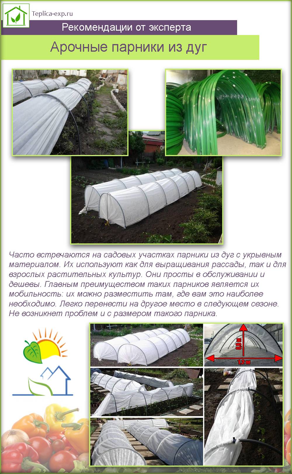 Парники из дуг с укрывным материалом – самый простой способ защитить растения от заморозков и перепадов погоды. Конструкция такого парника предельно проста, а установка занимает считанные часы. Парники можно приобрести в магазинах в виде наборов дуг разной высоты или сделать своими руками.