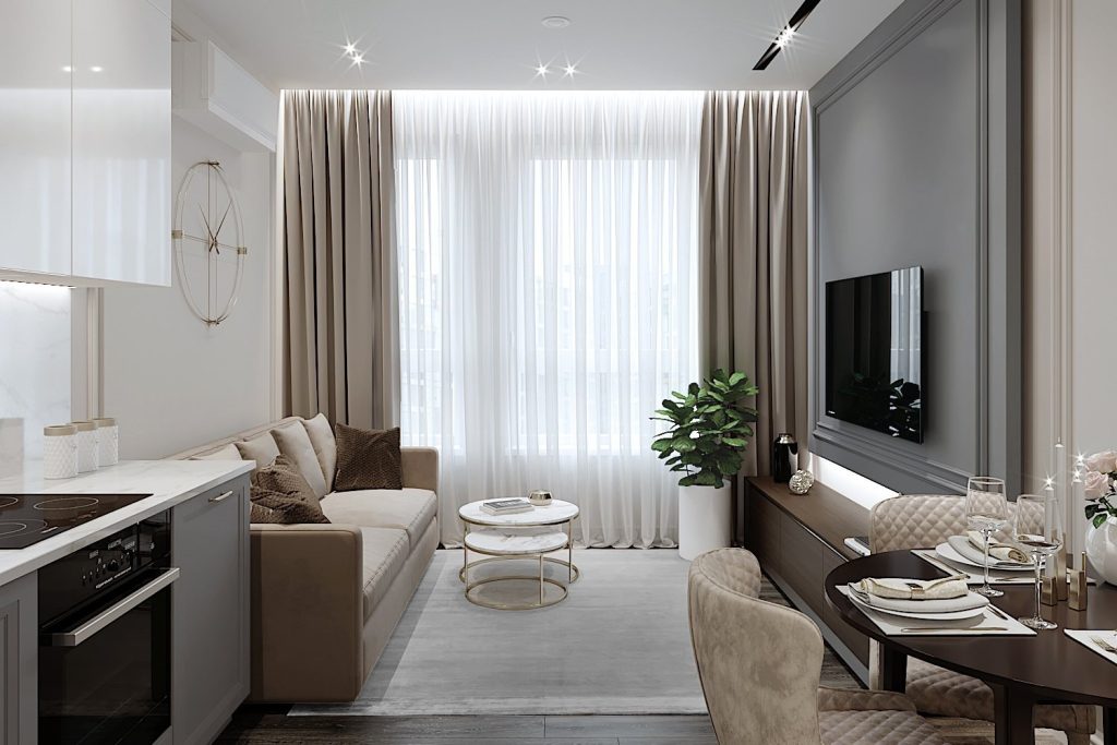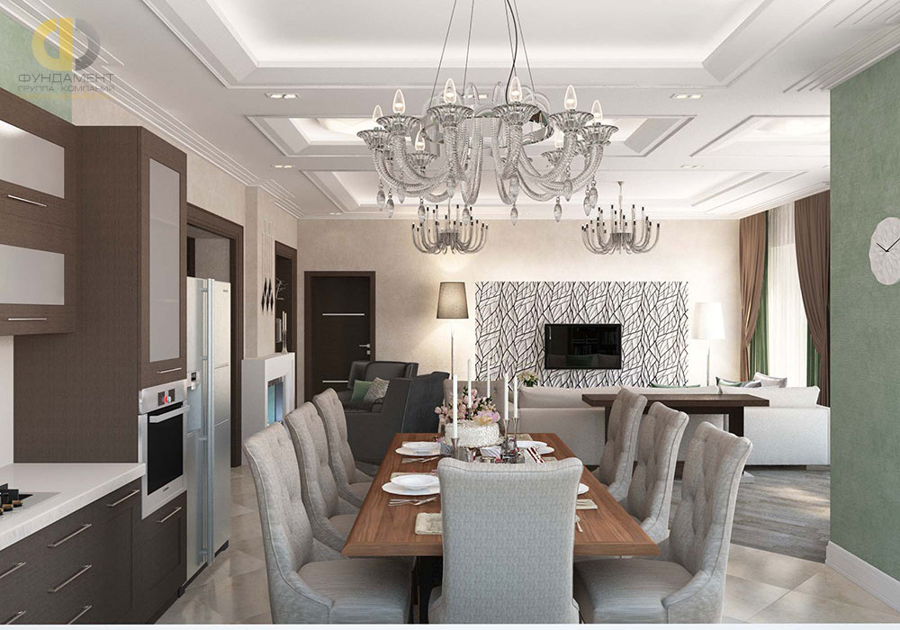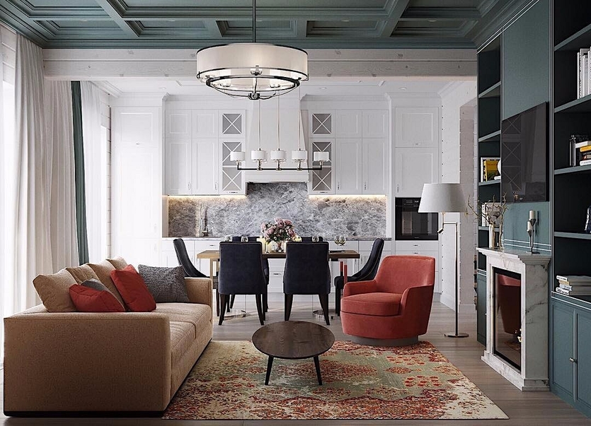 Классика всегда актуальна в интерьере гостиной и кухни, это добротный роскошный стиль, указывающий на статус хозяев дома. Для отделки используются только натуральные материалы светлых цветов. А вот мебельные гарнитуры выполняются и из тёмных пород дерева, на нейтральном фоне она смотрится наиболее выигрышно. Для обивки можно выбрать натуральные ткани — атлас, шёлк, бархат. В качестве узоров используется неяркая полоска, золотое или серебряное шитьё (особенно актуально для рококо и барокко как разновидностей классики).