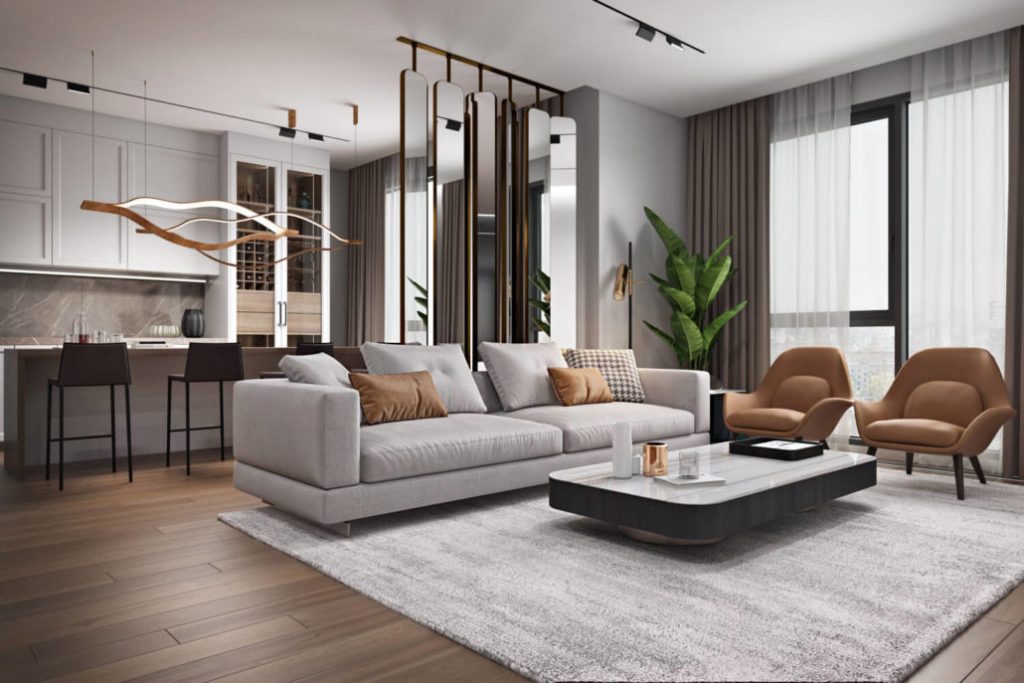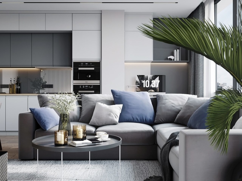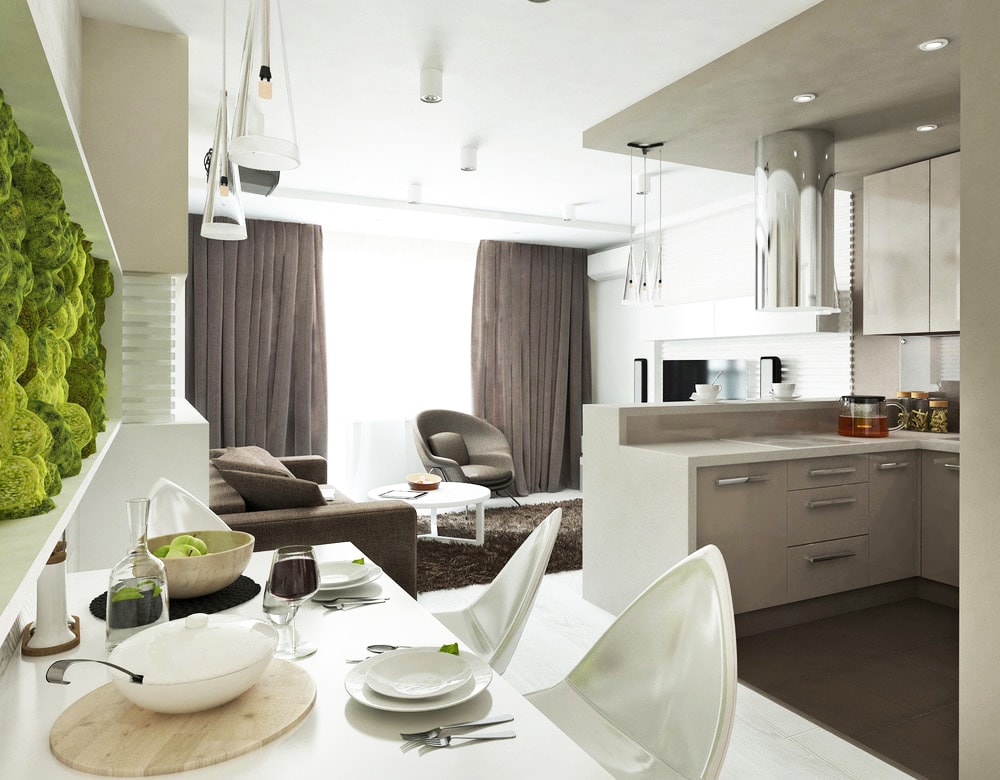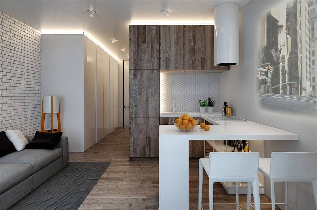 Такая планировка станет отличным вариантом для молодой семьи с маленькими детьми. Таким образом кухня скромных размеров превращается в удобную и уютную гостиную. Чтобы визуально разделить пространство на отдельные зоны, используют: