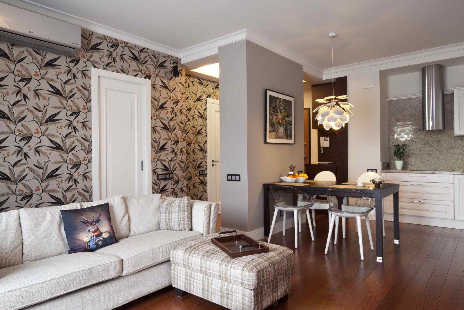 – Разные цвета в кухне-гостиной 18 кв. Выбирая, например, обои разных цветов,