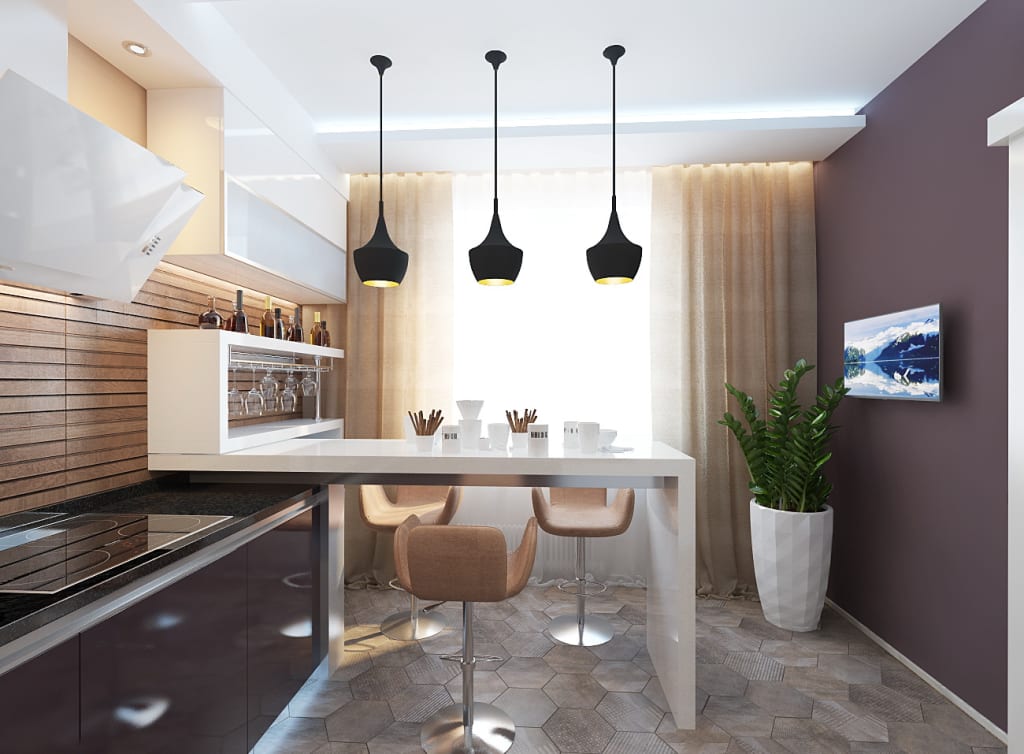 Барная стойка. Ее можно сделать продолжением гарнитура или отдельно стоящей. Если семья небольшая, то барная стойка может одновременно служить обеденной зоной.