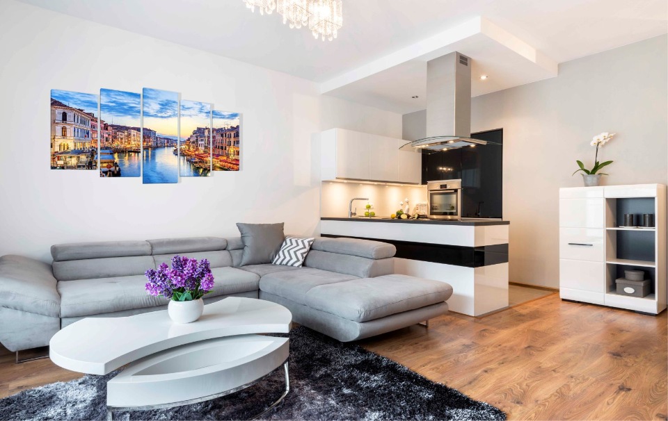Ковёр, модульные картины, другие предметы интерьера, призванные создавать уют, могут визуально отделить гостиную.