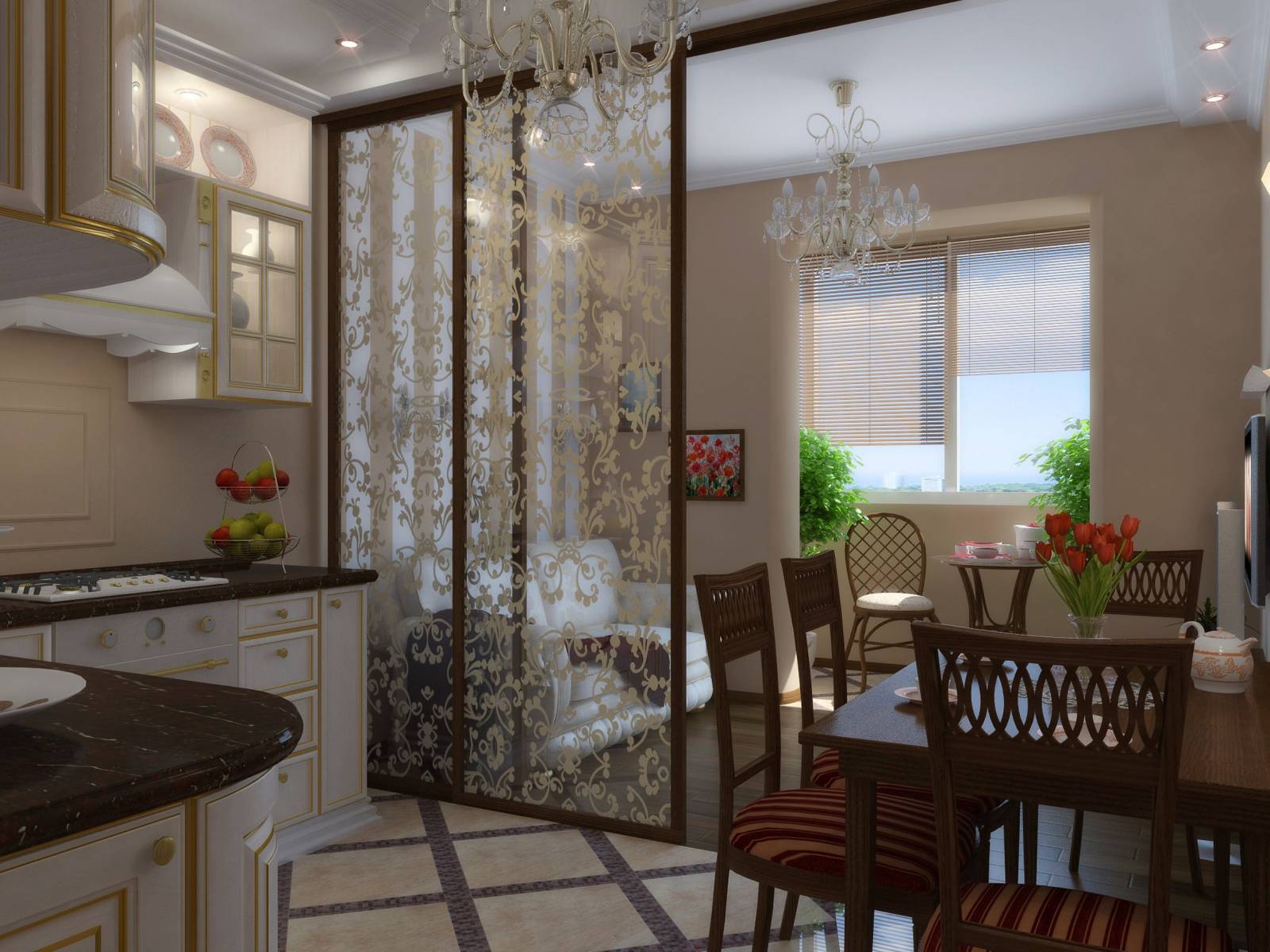 Легкие перегородки установленные на границе между кухонной и гостиной зонами, служат не только для зонирования, но в качестве декоративного украшения. Если кухня газифицирована, перегородка должна быть сплошная, по технике безопасности. Используют двери-купе и конструкции из стекла, которые полностью ограждают кухонную зону. В остальных случаях хорошо смотрятся пластиковые, тканевые, стеклянные модели с рисунками. Актуальные сквозные варианты из реек, бамбука, резные деревянные или кованые.