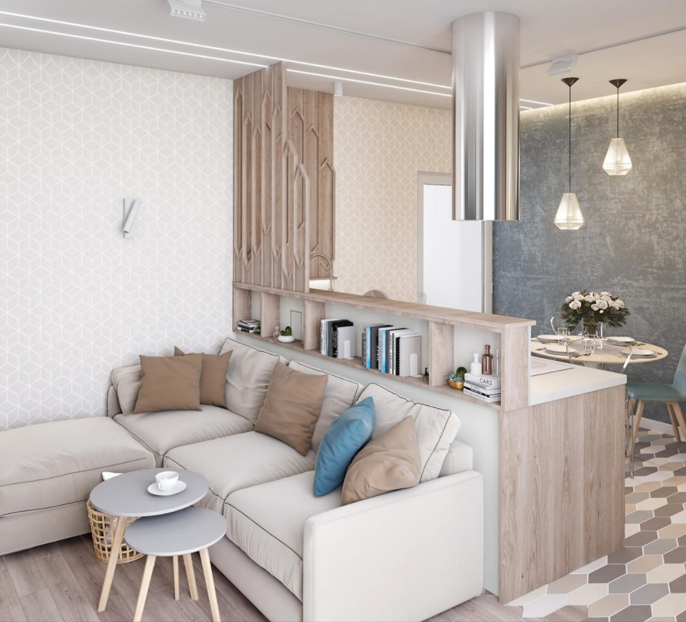 Крупного размера мебель становится функциональной и фактической границей. Устанавливают диван спинкой к кухонному гарнитуру, барную стойку на пересечении границ зон или обеденный стол. Интересно смотрится сквозной стеллаж, который дополняют книгами, растениями, декором.