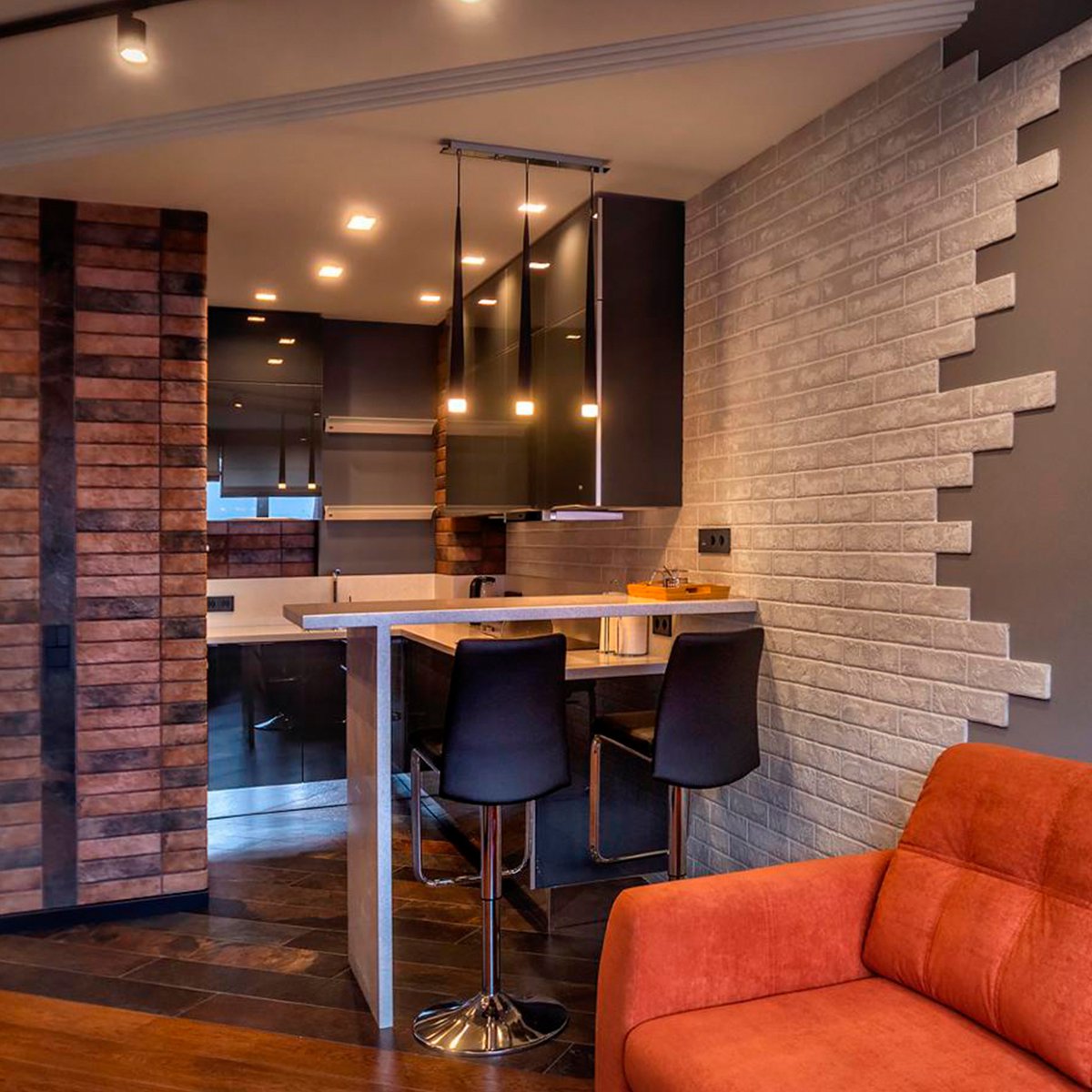 Для того чтобы не загромождать интерьер лишними предметами, можно зонировать комнату с помощью мебели. Идеальным вариантом является барная стойка. Такой предмет не только практичен, но и функционален. Стойка визуально отделяет область отдыха от рабочего места.
