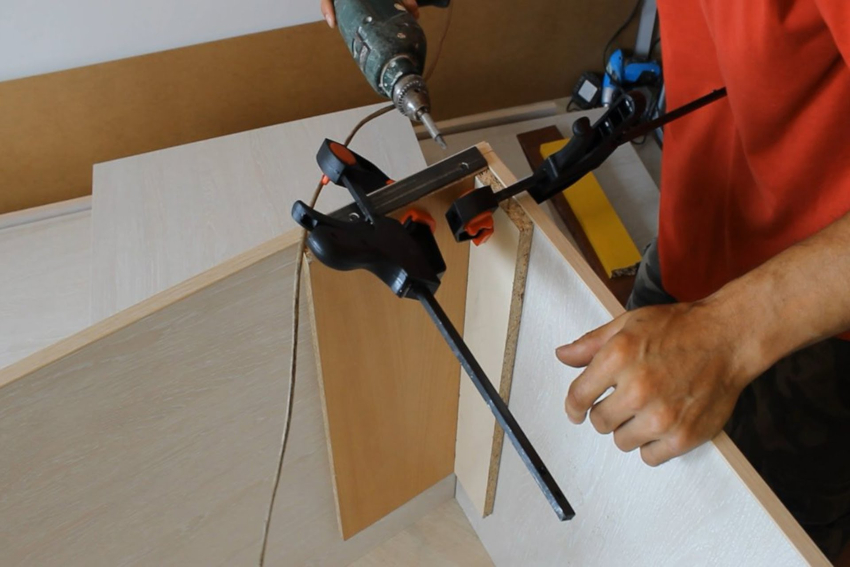 При необходимости устанавливают боковые, заднюю панель конструкции. Крепление саморезами рекомендуется дополнительно укрепить с помощью столярного клея. Готовую конструкцию шлифуют, обрабатывают лаком или краской по желанию.