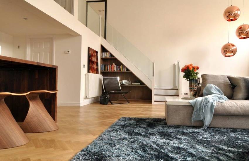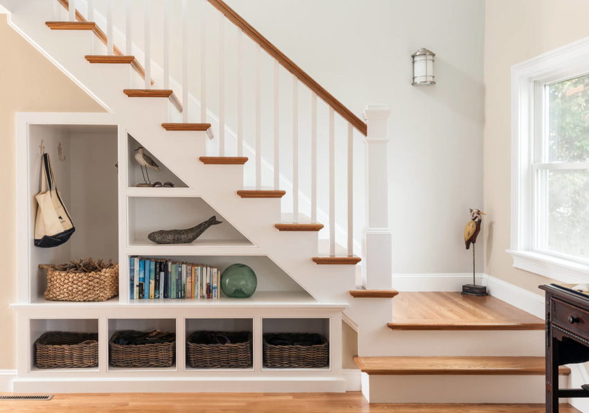 Такие габариты позволяют организовать под лестницей системы хранения бытовой техники, громоздких предметов, одежды, обуви, а также оборудовать винный магазин или мини-бар, полки для сувениров, ТВ-зону или уголок с аквариумными рыбками.