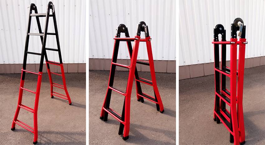 Современная модель «трансформер» представляет собой «гибрид», который объединяет функциональные возможности стремянки и лестницы приставного типа. Приспособление состоит из нескольких модулей, количество которых составляет от двух до четырех, соединенных шарнирами с замковым механизмом. Это позволяет легко и быстро придавать конструкции необходимую геометрическую форму в виде буквы «Г», «П», «Л», «М».
