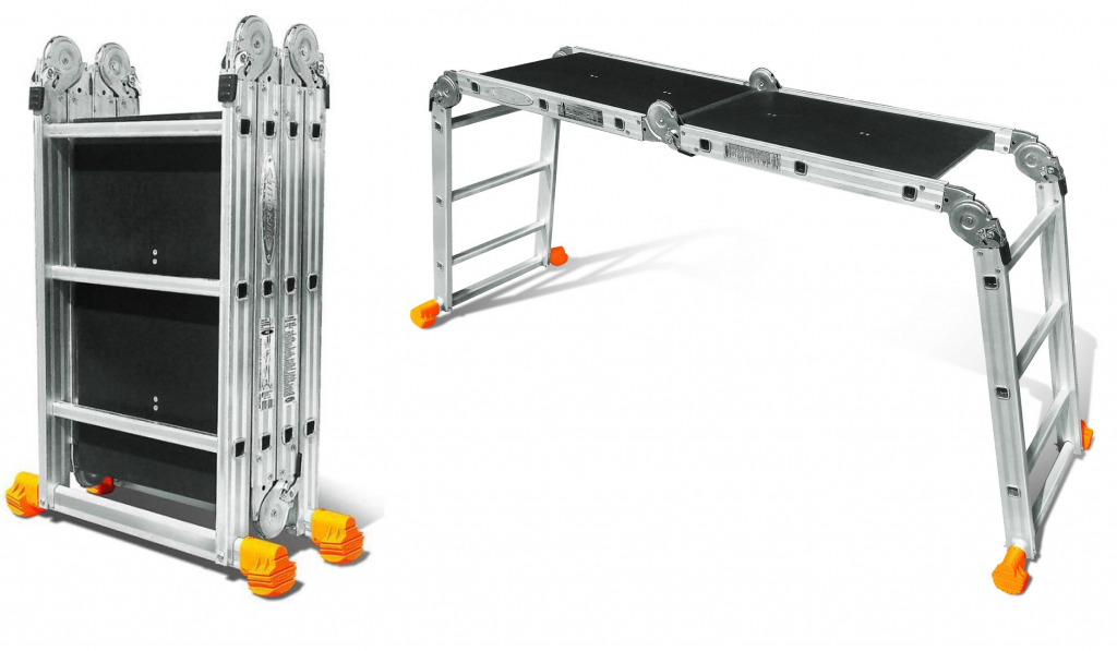 Четырёхсекционное изделие, соединённое с помощью шарнирных креплений, имеет от 3 до 6 ступеней в одной секции, отлично подходит для многих видов работ