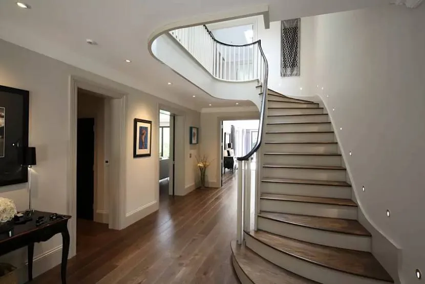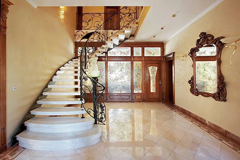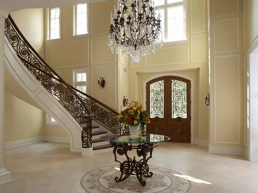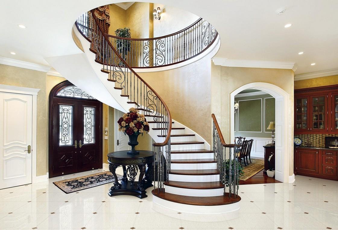 В холл, сделанный в классическом стиле, отлично впишется полукруглая лестница с кованными перилами