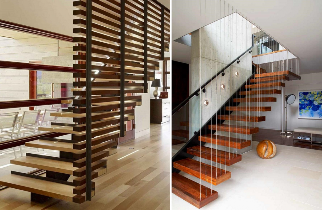 - К модерну подойду невесомые лестницы. Конструкция включает в себя «парящие» ступени, прикрепленные без видимых силовых элементов к стене или на больцах.