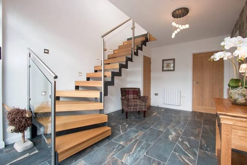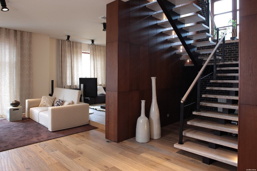Лестницы на тетивах устанавливают, как правило, в небольших загородных домах. Среди положительных моментов таких сооружений отмечают следующие: