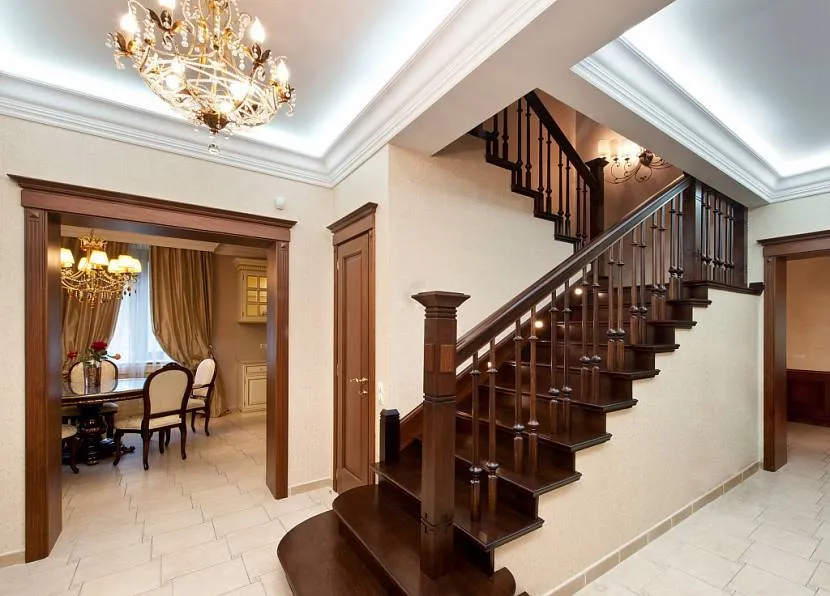 Это относится и к лестнице. Оформление должно быть вызывающе роскошным, поэтому оправданы различные украшения и сверкающие вставки, резьба по дереву на перилах и стойках, детали из начищенной бронзы и элементы из кованного железа. Все это превратит лестницу в произведение искусства.