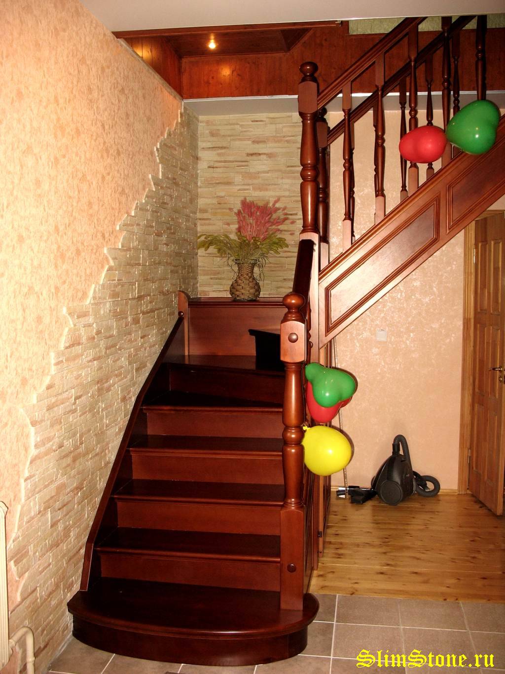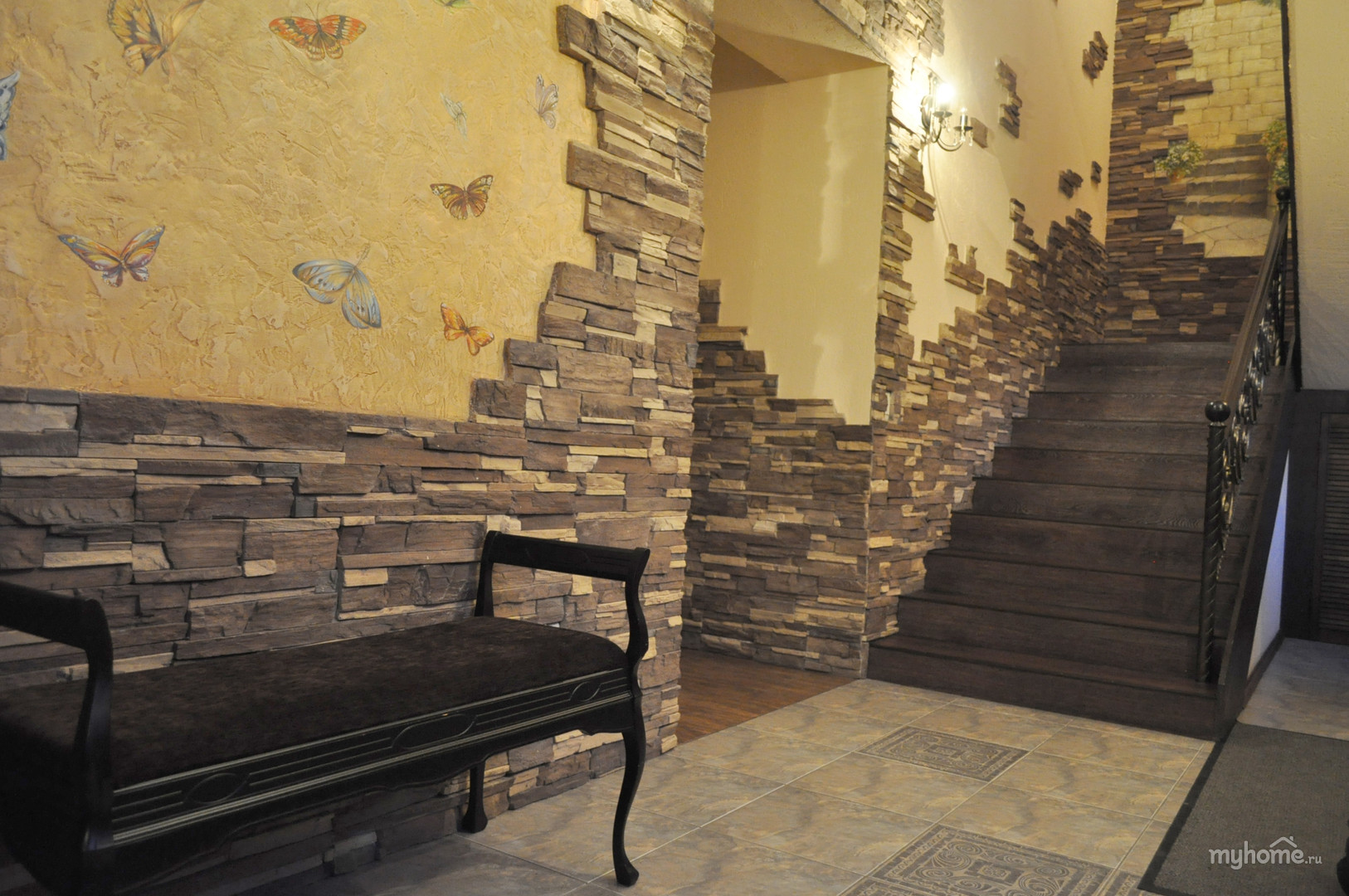 - Хорошая прочность. Окружающее пространство рядом с лестницей будет подвергаться интенсивной эксплуатации, поэтому оно должно выдерживать длительное воздействие. К тому же, на второй этаж вы явно не раз поднимете что-то крупногабаритное и столкновения со стенами не избежать. Искусственный камень легко справляется с такими нагрузками.