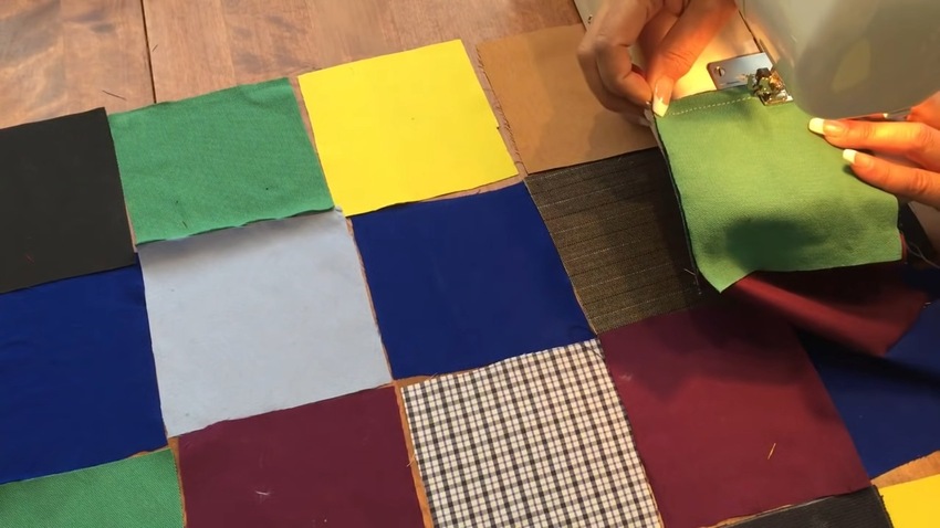 | 3 | ![]() | Для удобства разложите все квадраты на полу или на обширной рабочей поверхности, собрав из них одеяло. Затем начните сшивать каждый отрез между собой, изготавливая полосы из сшитых квадратов. Для удобства предварительно скрепите фрагменты иголками. Каждую из полос отутюжьте, тщательно разглаживая швы. |