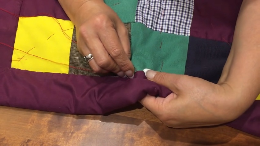 В этом случае немаловажное значение имеет и окрас нитей, ведь они должны идеально подходить под цвет самого материала. Однако, в некоторых случаях мастерицы намеренно выбирают радикально отличающийся цвет ниток, и таким образом дополнительно декорируют одеяло. Булавки, лапки и иголки