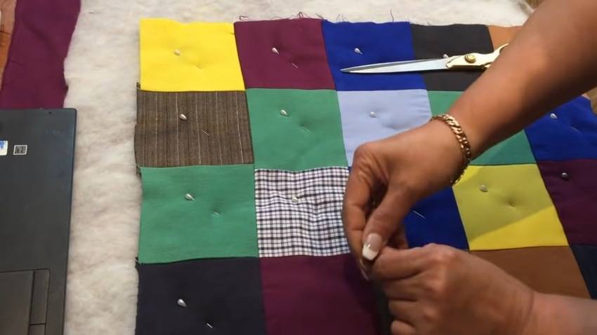 Далее предстоит приступить к процессу шитья одеяла. Первым делом фрагменты денима присоединяют друг к другу с изнанки. Таким образом шов будет на лицевой части одеяла, его ширина — около 15 миллиметров