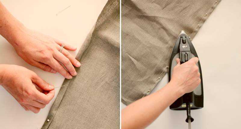 - Кладем ткань на стол «лицом» вниз, загибаем ее края на 1 см на изнанку, фиксируем загибы булавками (при необходимости наметываем) и утюжим по всему периметру ткани.