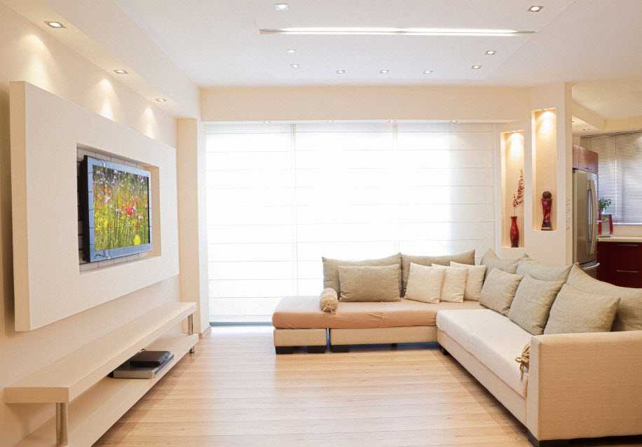 Вообще комнату можно назвать маленькой при метраже до 12 метров квадратных. Все что больше, уже средний размер. Для расширения пространства гостиную комнату объединяют с кухней, прихожей или балконом. Объединить помещения можно посредством демонтажа одной или нескольких стен, главное – убедиться, что стена не несущая. Другой вариант, менее радикальный, — возведение арочных сводов или сквозных ниш вместо дверных проемов. Широкая арка из гипсокартона подойдет для объединения гостиной с балконом, а если в ней создать нишу с полками, то в ней удобно разместятся горшки с цветами. Учите, что официально согласовать объединение гостиной с балконом очень сложно.