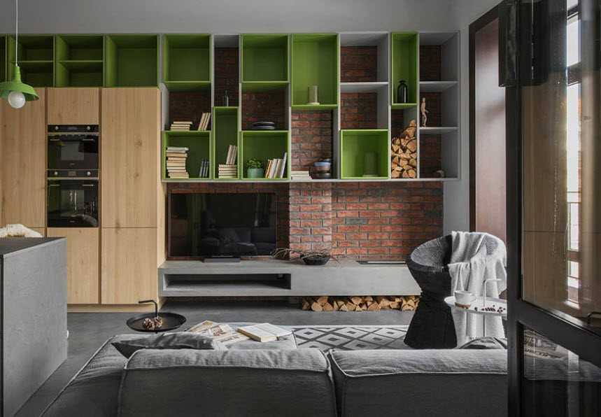 На открытых полках стеллажей могут располагаться интерьерные цветные свечи, оригинальные статуэтки и коллекционные издания книг. Органично вписывается в дизайн небольшой гостиной маленький электрический камин.