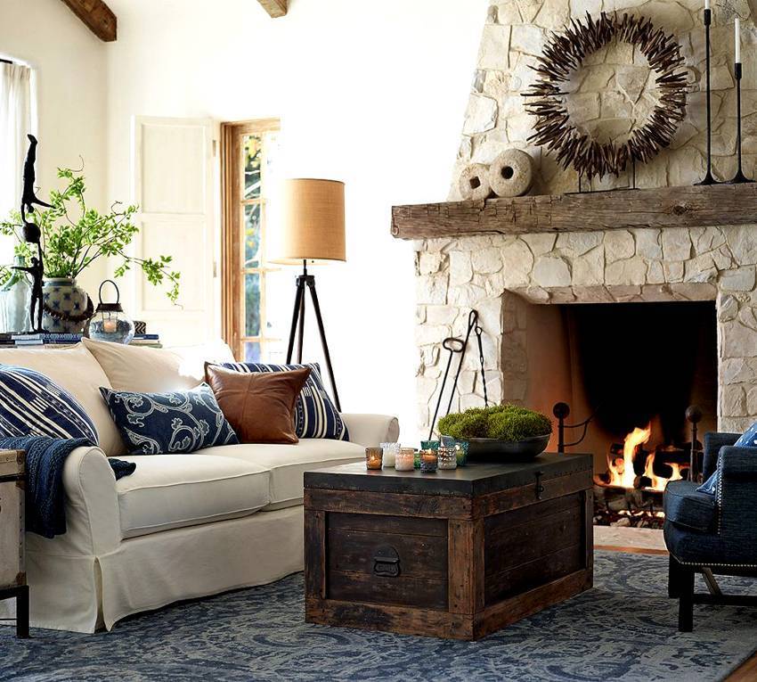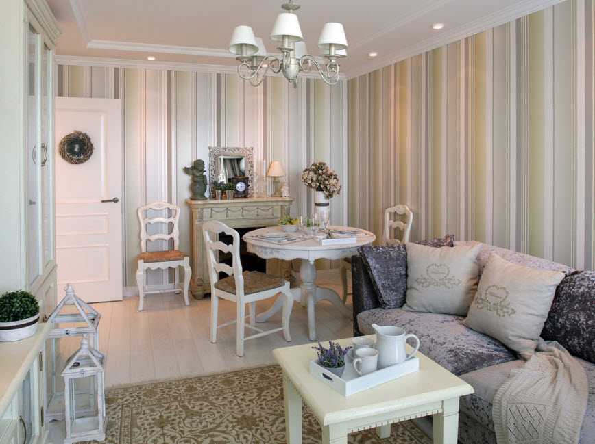 Прованс – романтический стиль, который пришел к нам из южных берегов Франции. Деревенское оформление наполнит интерьер маленькой гостиной нежностью и растительными мотивами, флористическими узорами и кружевной отделкой. Что касается цветовой гаммы, то лучше отдать предпочтение серому и бежевому, розовому и персиковому тонам. Мебель должна быть деревянной с эффектом старины, что позволит создать особую атмосферу. Прекрасным дополнением станет фарфоровая посуда, живые цветы и камин.