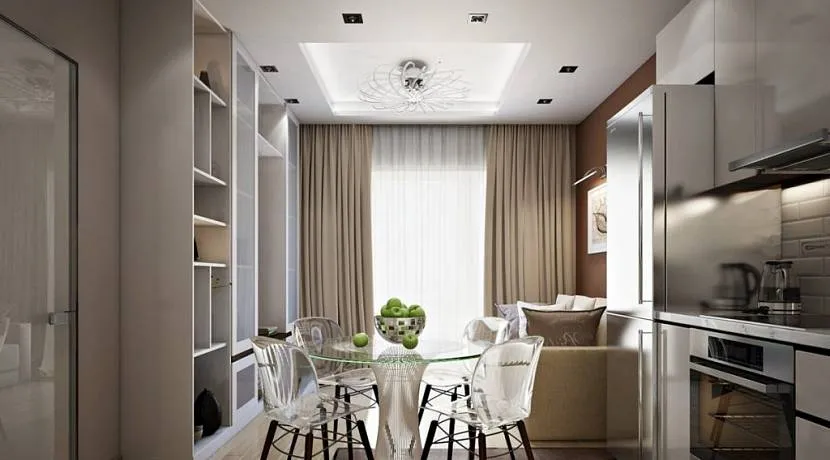 Однако недостатки тоже присутствуют, а небольшой метраж помещения делает их еще более заметными. К недостаткам, прежде всего, относятся распространение запахов еды в зону отдыха, шум кухонной бытовой техники и необходимость поддержания идеальной чистоты на кухне, чтобы не портить общее внешнее впечатление от комнаты.