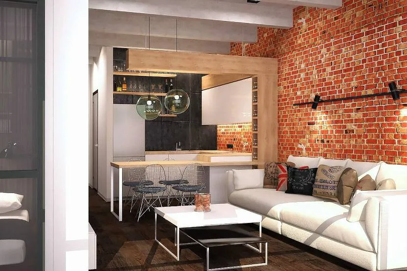В прямоугольной удлиненной комнате часто зона отдыха располагается под окном в торце. Кухня занимает более темную долю помещения, где в любом случае нужен дополнительный свет. Кухонный гарнитур может быть параллельным, угловым. Органично отделит эту часть небольшая барная стойка, которая займет меньше места, чем обычный стол со стульями или даже табуретками.