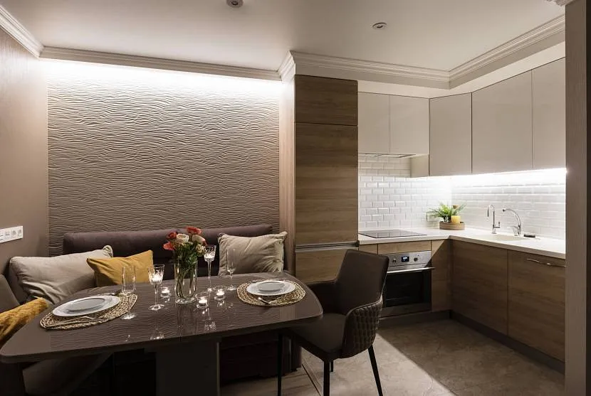 Это очень важно для малогабаритной квартиры, позволяет легко зонировать эти зоны. Объединённая кухня и столовая вместе с гостиной позволяет удобно разместить гостей, а также быстро накрывать и убирать со стола, не переходя из одной комнаты в другую